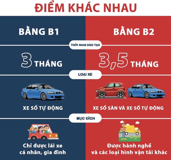 Về cơ bản theo quy định truyền thống, sự khác biệt lớn nhất giữa hai loại bằng này nằm ở hệ thống hộp số (số tự động so với số sàn) và đặc quyền tham gia kinh doanh vận tải. Người có bằng B1 chỉ được lái xe gia đình, trong khi bằng B2 mở rộng quyền hạn cho phép chạy taxi, dịch vụ công nghệ.