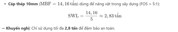 - Tính theo dữ liệu nhà sản xuất: MBF của cáp 16mm thường đạt ~150kN (~15.3 tấn). Với FOS 5:1, SWL = 15.3 / 5 = 3.06 tấn.